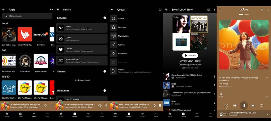 In the set of images above you can see the audio services available on the EVO 150 SE, a wide range of online radio stations, along with well-known streaming platforms such as Tidal, Qobuz, Deezer and Amazon Music. Further on, you can also see how Qobuz looks when accessed through the StreamMagic app.