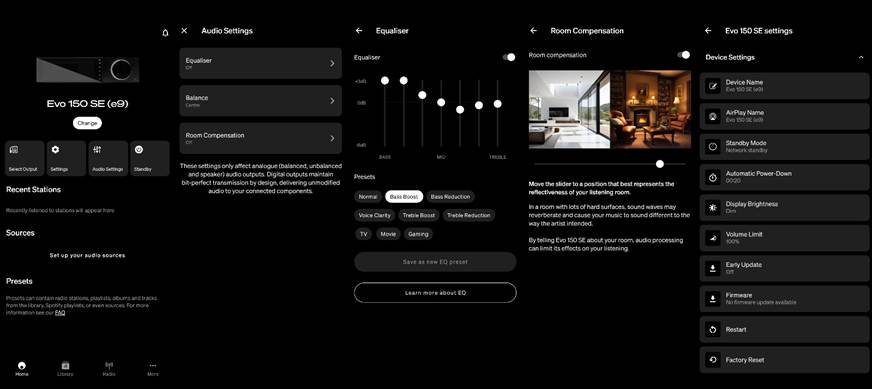 In the set of screenshots above you can see the Home page of the app, the sound settings section, including Equaliser, Balance and Room Compensation, as well as the general app settings.