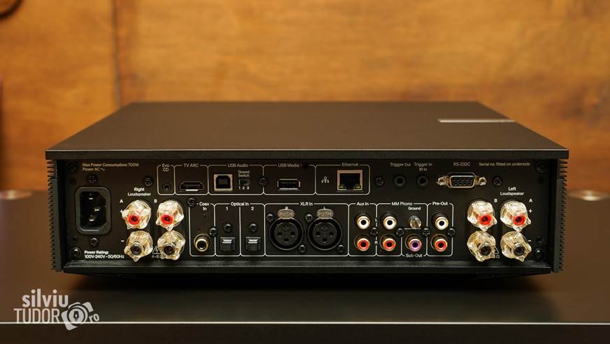 Connectivity is very rich and complete, with analog RCA and balanced XLR inputs, an MM phono stage for turntables, optical, coaxial and HDMI ARC digital inputs for modern sources, as well as a USB-B port. In addition, the EVO 150 SE supports Bluetooth aptX HD, AirPlay 2 and Google Cast, and is compatible with multi-room systems, such as Google Home and Roon, offering extended wireless flexibility. The unit also features Pre-Out outputs, including a dedicated subwoofer output. It is also worth noting the dual speaker terminals, which support either two pairs of speakers or a bi-wiring configuration.